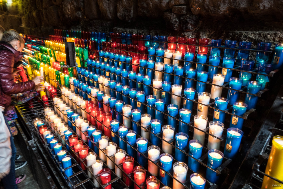 Длинная галерея со свечами слева от монастыря. Свечей тут очень и очень много, каждая стоит 2,2 евро. На электричество, как многие храмы в Европе, они еще не перешли. Впрочем, в этих краях электричество стоит дорого, так что, вероятно, свечи обходятся дешевле.
