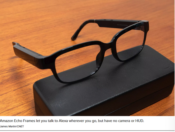 Echo Frames - умные очки. Никаких камер, проекций или чего-то в этом роде. Два динамика, микрофоны, очками можно управлять через боковую сенсорную поверхность. Могут зачитывать вам пришедшие на смартфон сообщения, проигрывать музыку. Стоят $200. И все это - только чтобы получать из очков пришедшие на смартфон сообщения? А, еще очки будут постоянно вас прослушивать и для того, чтобы дать команду смартфону, не нужно нажимать кнопку. И вот заряжать их при этом нужно каждый день.