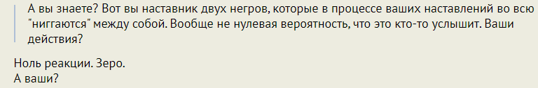 «После чего на вас строчат донос, что вы поощряете использование расистских терминов вашими подопечными, вместо того, что бы сделать им замечание. Бабах, увольнение с работы с клеймом "расист" на лбу и все такое. Надеюсь, вы сейчас не будете убеждать меня, что это прям вот совершенно невозможная ситуация?»