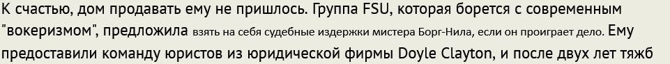 К счастью, дом продавать ему не пришлось. Группа FSU, которая борется с современным "вокеризмом", предложила взять на себя судебные издержки мистера Борг-Нила, если он проиграет дело. Ему предоставили команду юристов из юридической фирмы Doyle Clayton, и после двух лет тяжб Трибунал по трудовым спорам постановил, что Lloyds несправедливо уволил мистера Борг-Нила и подверг его дискриминации (у него еще и дислексия, что юристы приводили в качество оправдания того, что Карл посмел произнести это ужасное слово целиком). Ему была присуждена компенсация в размере почти 490 000 фунтов стерлингов. В сочетании с судебными издержками Lloyds и налогами банку грозит счет в размере около 1 миллиона фунтов стерлингов.