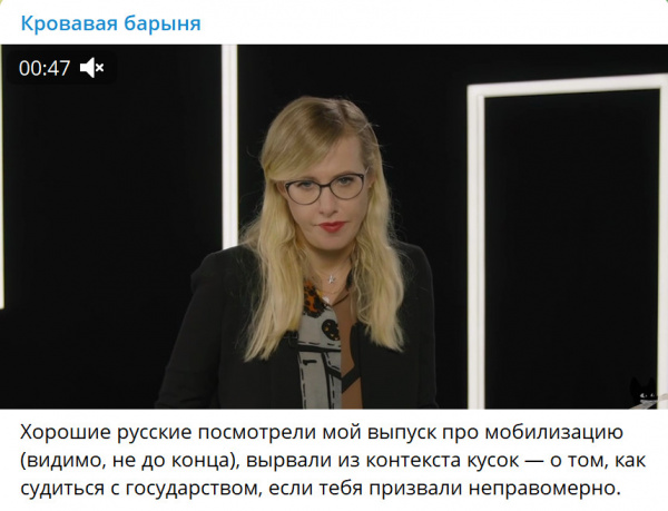 Значит так, двустульная ты моя, слушай сюда. Времена, когда можно прикрываться тем, что ты там чего-то со всех сторон рассмотрела – прошли. За то, что ты делаешь сейчас, придётся отвечать безо всяких экивоков. У тебя в студии 25 минут сидит лысая залупа, которую ты представляешь как всезнающего юриста, и рассказывает, как надо идти в военкомат и ехать на сборы. То, что ко второму часу на пару минут появляется правозащитник, который говорит разумную вещь – никак не снижает ущерб от твоего поганого видео. О чём тебе сообщают твои же подписчики в комментариях. На твоих руках кровь. Никакие рассказы о том, что ты "с разных сторон" рассматривала, – на суде не помогут, если ты до него доживёшь.