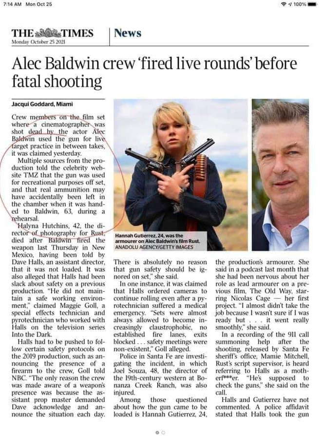 Есть основные правила пользования оружем, Болдуин тупо их не знает (или игнорирует). По правилам ты никогда не направляешь оружие на человека. Бывают очень редкие исключения, когда это нужно для съемок. В этом случае проверяют все по сто раз - есть даже специальная палочка, которую засовывают в ствол, убедиться, что там нет застрявшей пули.