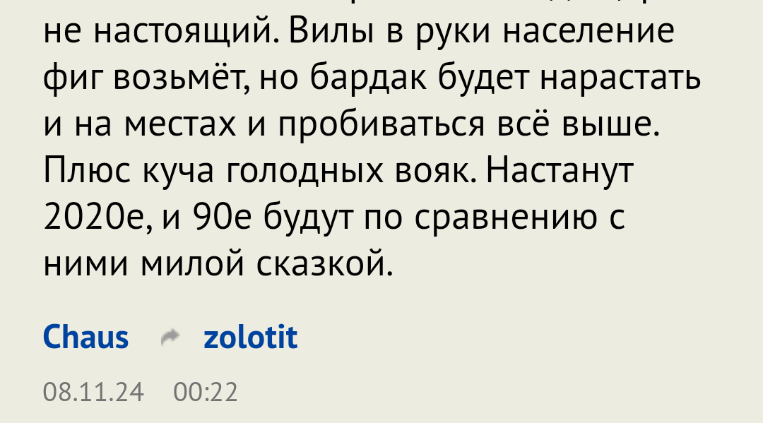 Мне в нескольких местах,где я считал что посетители вменяемые, пытались задвинуть тему, дескать Путин получит чутка территорий, и успокоится, и заживёт Украина с Россией душа в душу. Вот именно так, без тени смущения. Задаю эти ребяткам вопрос - а на кой ляд то Путин отжали Крым и развязал войну, и получаю совершенно феерические ответы. Оказывается отжатие Крым и война это неизбежное исторические события, они сбрасывают напряжённость, и позволяют реализовать новый формат отношений.