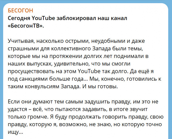 Гугл заблокировал канал Михалкова «Бесогон» с формулировкой про что-то там разжигающее. А потому не соответствующее либеральным правилам ресурса.