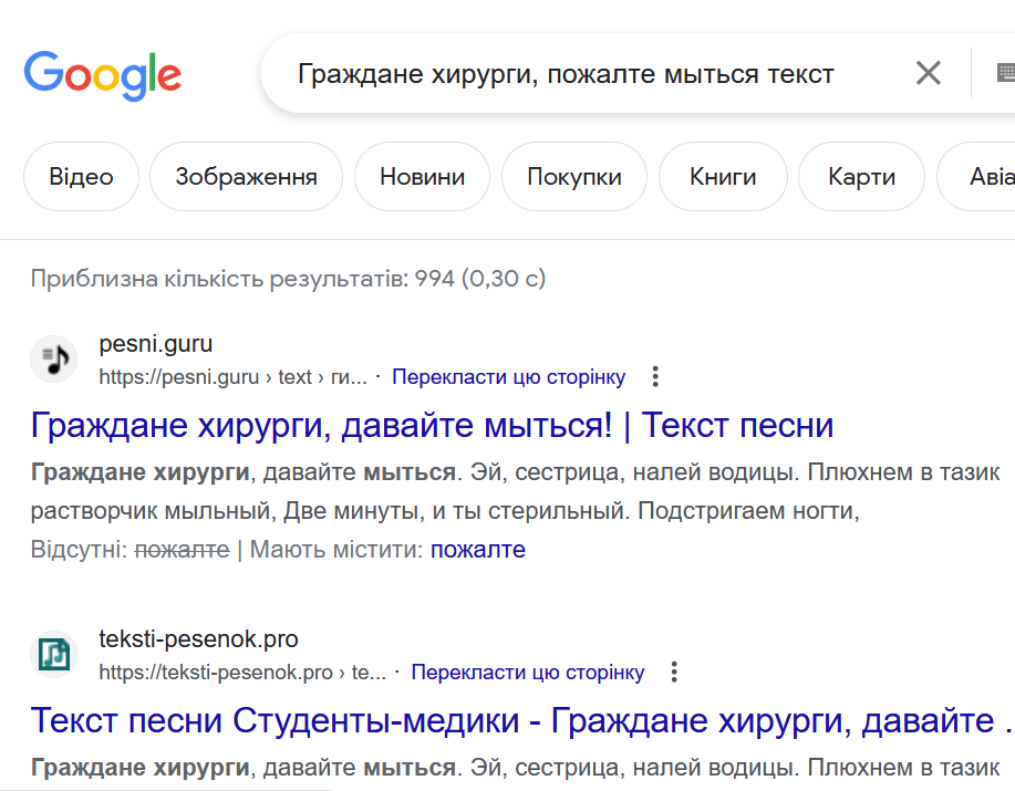 Искал текст песни "Граждане хирурги, пожалте мыться..." - пришлось лезть в Яндекс, который сразу предложил кучу вариантов текста. Пришлось потому, что Гугль не предложил НИ ОДНОГО.