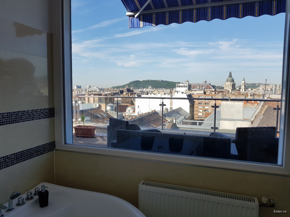 И здорово, что в ванной сделано панорамное окно, откуда также видна часть Будапешта. Лежишь себе в джакузи, думаешь о Шопенгауэре, наслаждаешься видами.