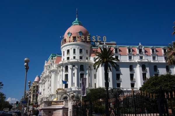 Отель забавный и своеобразный, поэтому имеет смысл о нем рассказать. Находится отель Negresco (вот их сайт) в Ницце на Английской набережной (она же - Променад). Со стороны набережной он выглядит вот так.