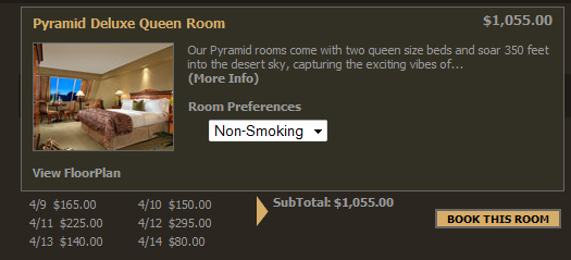 В Вегасе всегда такой цирк с ценами на номера. Цена на один и тот же номер за два обычных будних дня может различаться раза в четыре. Вот, посмотрите разлет на номер в Luxor. Во вторник - почти $300. В четверг - $80.