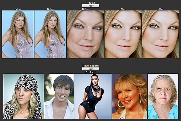 Очень наглядно показан эффект ретуширования (точнее говоря, отфотошопливания). Нажимайте на кнопку Toggle.