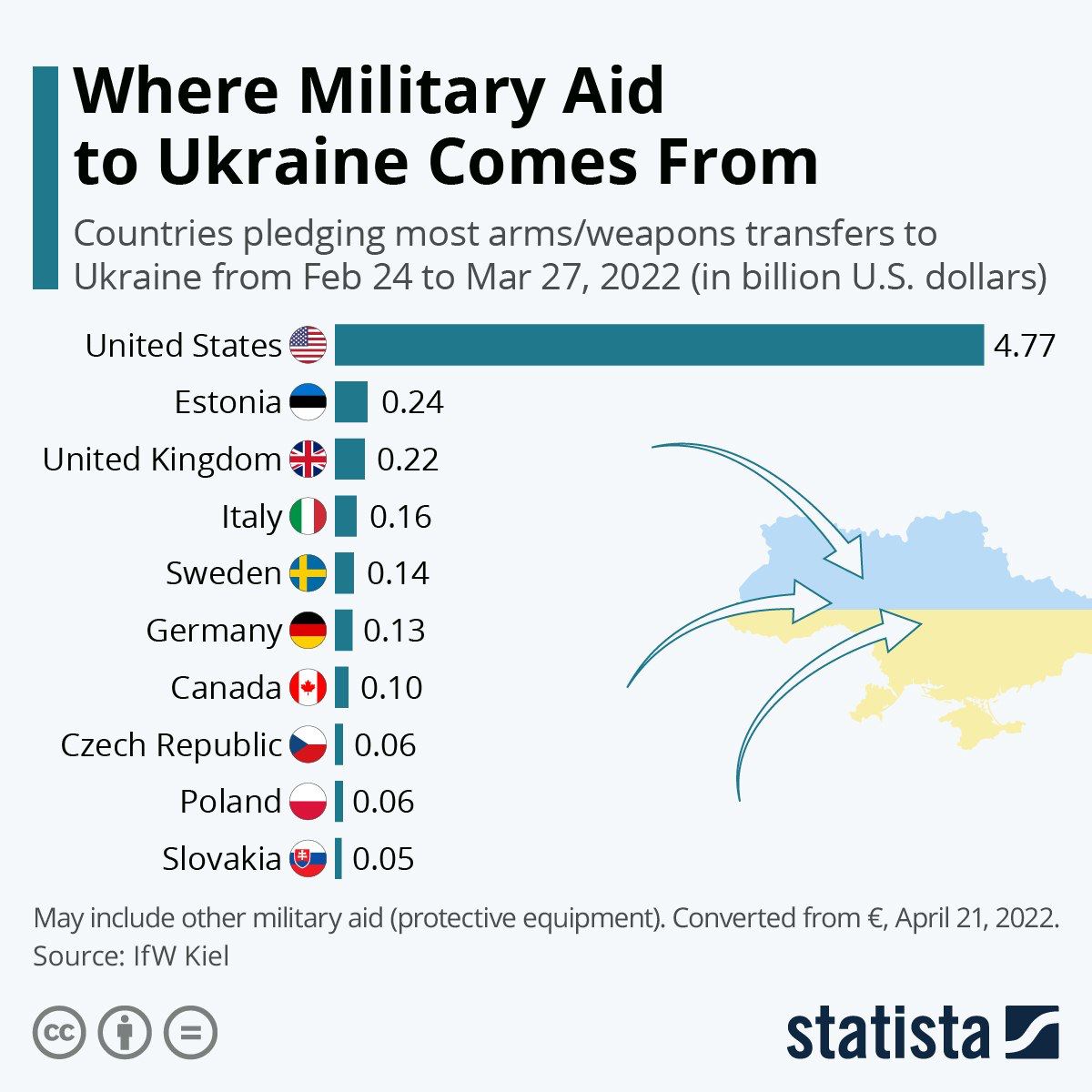 Компания Statista подготовила отчет по поводу того, откуда и в каком объеме в Украину приходит военная помощь - "Where Military Aid to Ukraine Comes From".