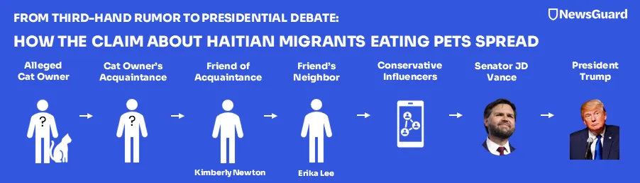 Журналисты издания NewsGuard's Reality Check провели целое расследование по поводу того, откуда вообще в голове Трампа взялась эта история с гаитянскими мигрантами, которые в городе Спрингфилде якобы поедают домашних животных простых американцев.