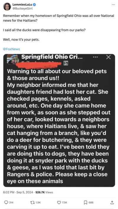 Тетка рассказала об этом другой тетке, Эрике Ли, жители Спринфилда, и та упомянула об этом в закрытой группе на Facebook, причем для "достоверности" она это все изложила в следующем виде: "Моя соседка сообщила мне, что у подруги ее дочери пропала кошка. ... Однажды она вернулась домой с работы и, едва выйдя из машины, посмотрела в сторону соседского дома, где живут гаитяне, и увидела, что ее кошка висит на ветке, как олень для разделки, и они разделывают ее, чтобы съесть. Мне сказали, что они делают это с собаками, они делали это в парке Снайдера с утками и гусями, как мне рассказали рейнджеры и полиция. Пожалуйста, внимательно следите за этими животными".