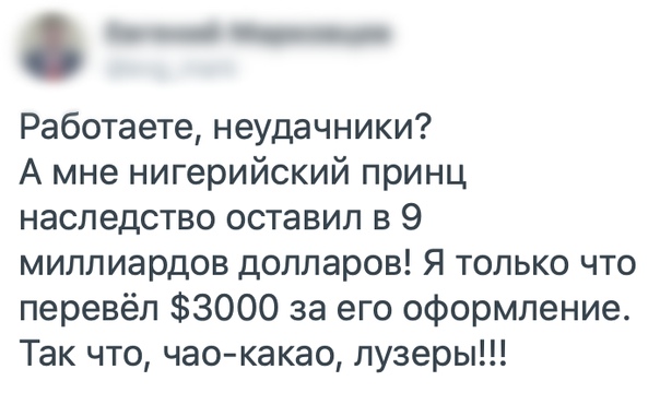 В университете на прошлой неделе пришел масс-емайл от якобы профессоров их студентам. Имена профессоров правильные, но емайл-адреса отправителей хрен знает какие. Емайл состоял из фразы "мне срочно нужна твоя помощь, и сообщи свой вотсапп-аккаунт". Три студентки откликнулись, и по вотсапу их проинструктировали накупить гифт-карт в Аппл-сторе в сумме на 12 K-CHF. Что они и сделали. У одной не было столько денег сразу, и она заняла денег у другой студентки. У последней хватило ума спросить "на что тебе, сестра, 10 килофранков?"