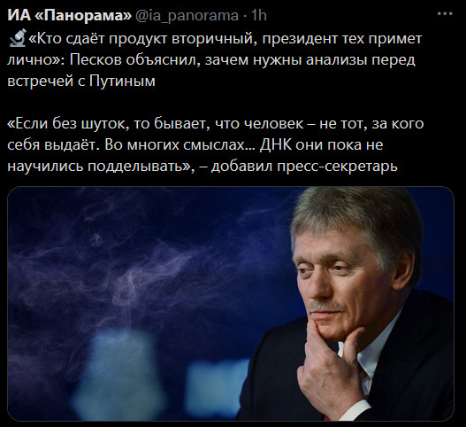 "Российским чиновникам, приближённым к президенту, значительно усложнили жизнь. Теперь они должны несколько раз в неделю сдавать кал. Всё дело, надеемся, в повышенных мерах безопасности.