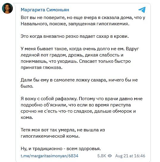 Я не говорю, конечно, что это 100% верные версии. Но они есть, и они правдоподобны, т.к. объясняют отдельные странности, типа почему Навального не выпускают в Германию, хотя есть оборудованный самолет.