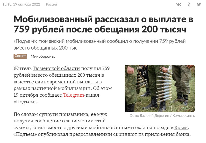 "Мобилизованным в Тюменской области начислили единовременную выплату в 759 рублей, рассказала «Подъему» супруга одного из призывников: