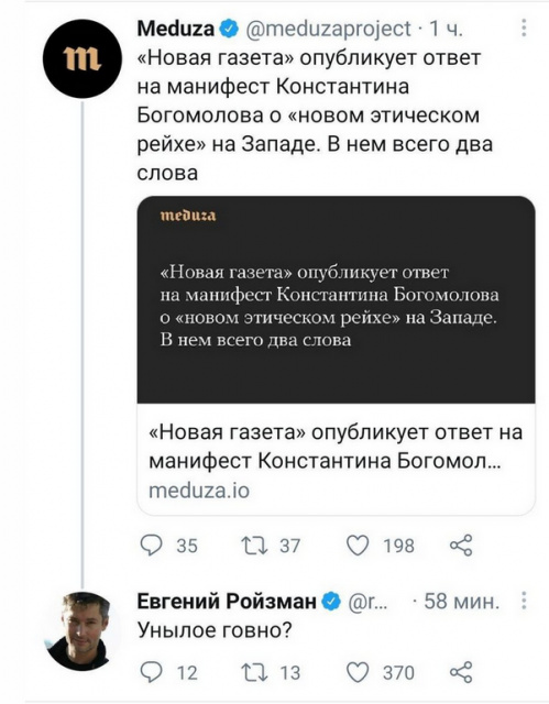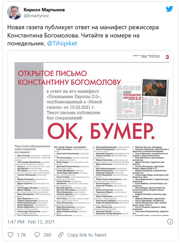 В понедельник в "Новой газете" будет опубликован ответ Константину Богомолову, опубликовавшему на странице "Новой" свой так называемый манифест. Ответ будет состоять из одной короткой строчки.