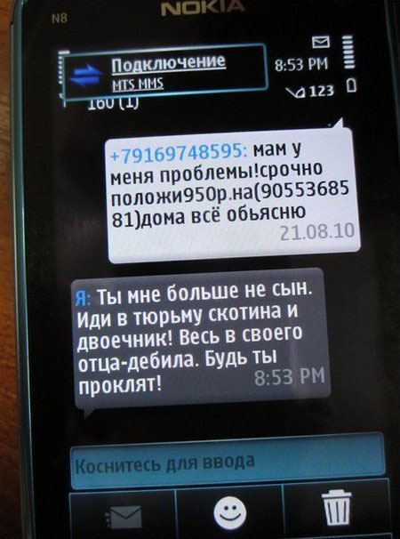 Всем наверняка на мобильник приходили SMS со стандартной разводкой из серии: "Мам (пап, Серег, Марин), положи срочно на этот номер 650 (950, два миллиона) рублей, я потом все объясню". На картинке показано, как именно следует отвечать на эти сообщения. (Вообще их, конечно, нужно просто игнорировать, но тем не менее.)