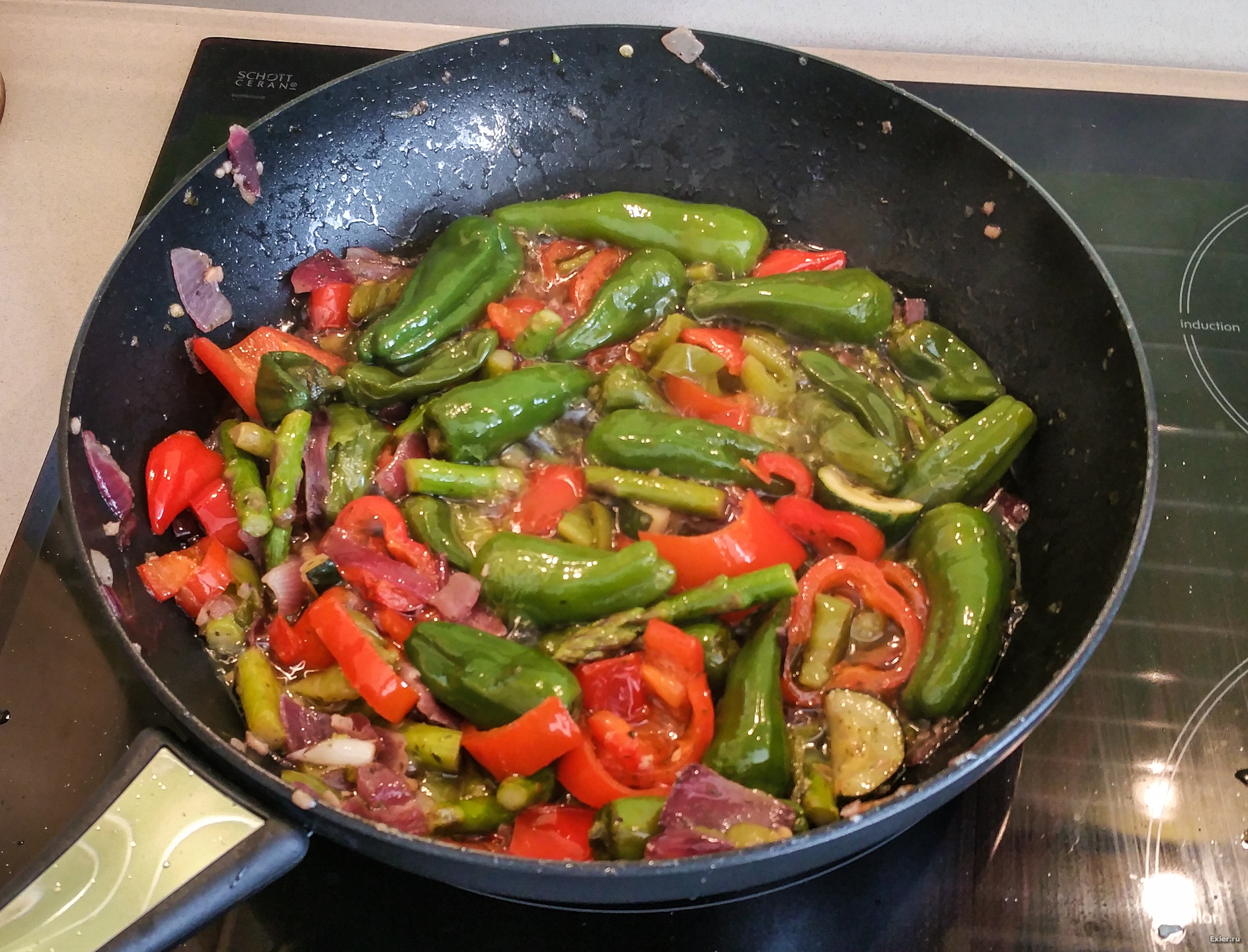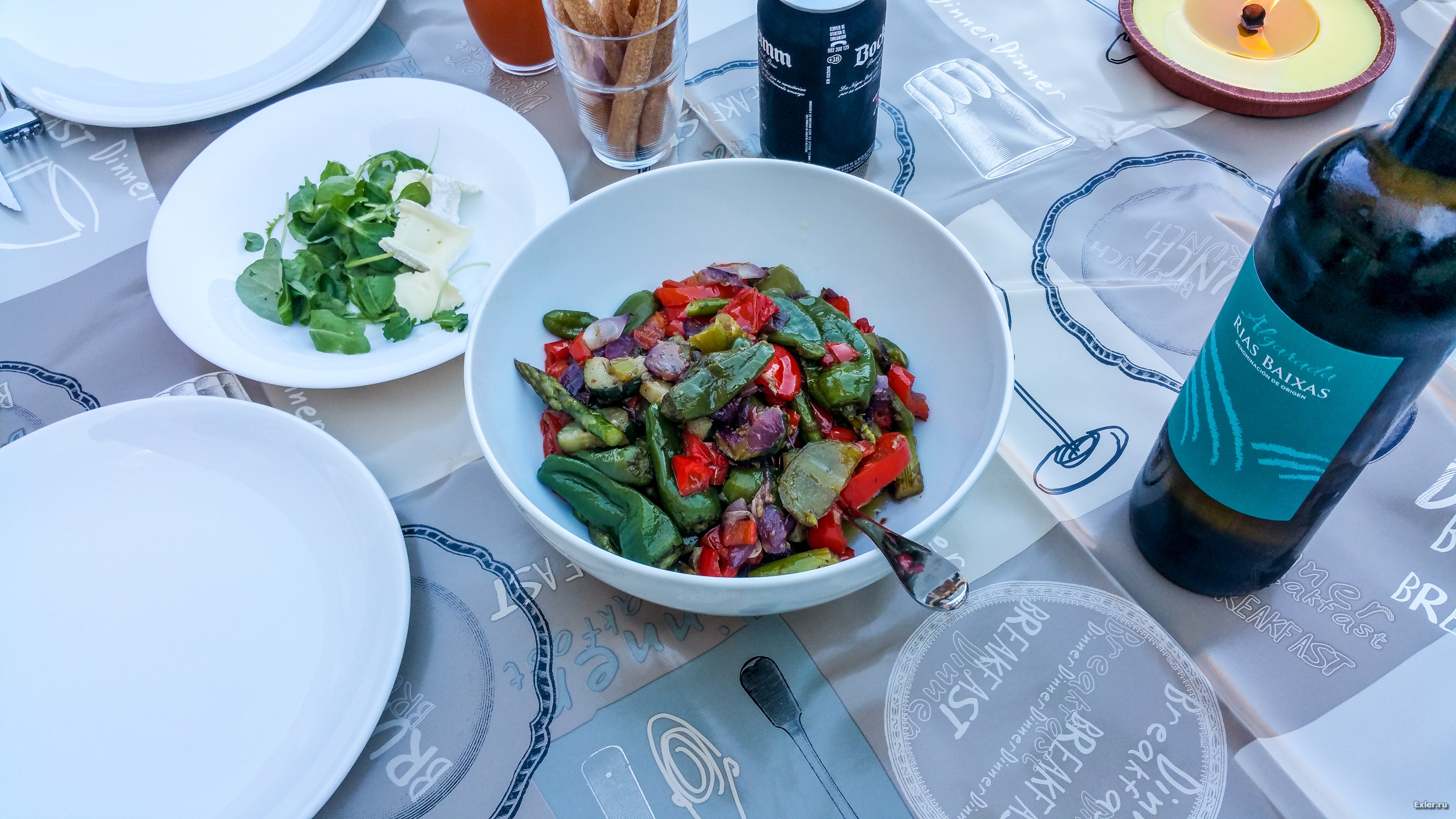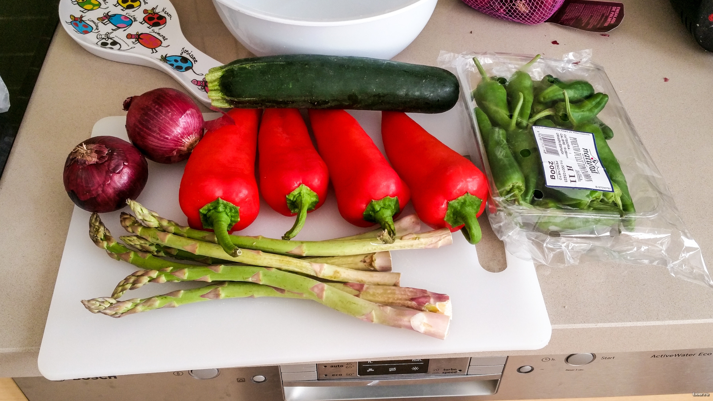 Берется несколько перцев (я взял большие красные и маленькие зеленые), пара луковиц, кабачок, также можно добавить спаржу. Режется в миску (маленькие зеленые я даже и не резал, их можно целиком).