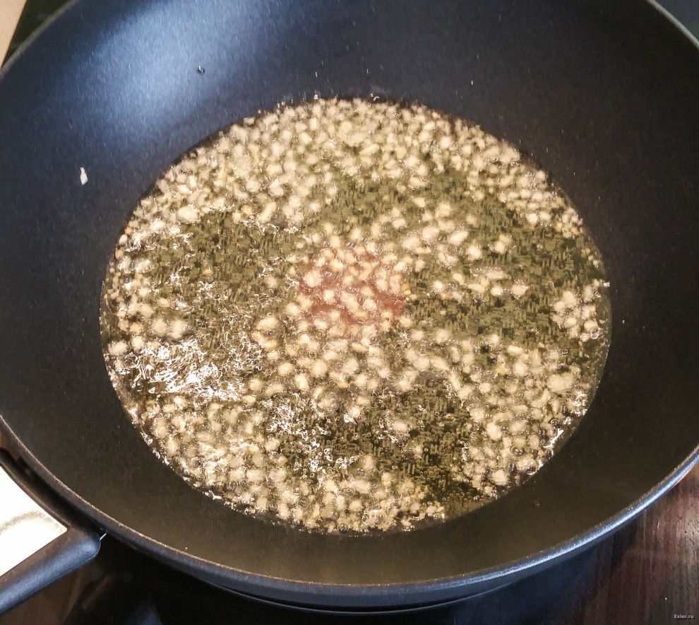 Берем сотейник (или вок), на дно наливаем немного масла, доводим до соответствующей температуры, кидаем туда давленый чеснок, соль, перец и другие специи по вкусу. Обжариваем чеснок до светло-золотистого цвета.