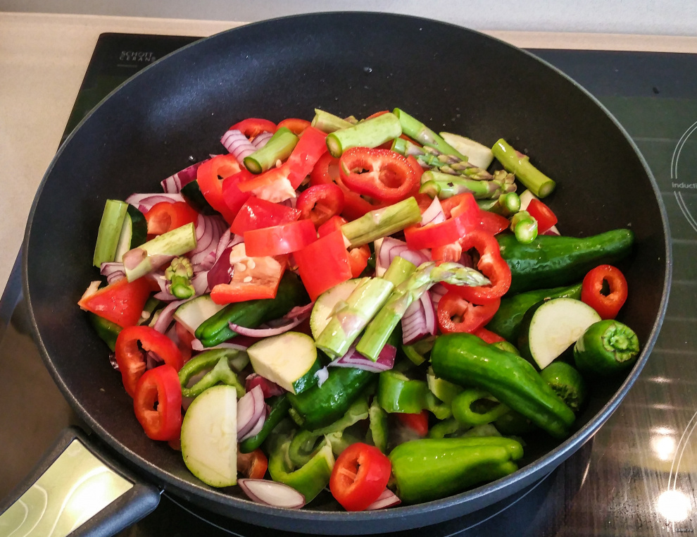В сотейник фигачим подготовленные овощи. Готовим на максимальном (от плиты зависит, но лучше сильный нагрев) огне примерно 20 минут, часто перемешивая (каждые пару-тройку минут).