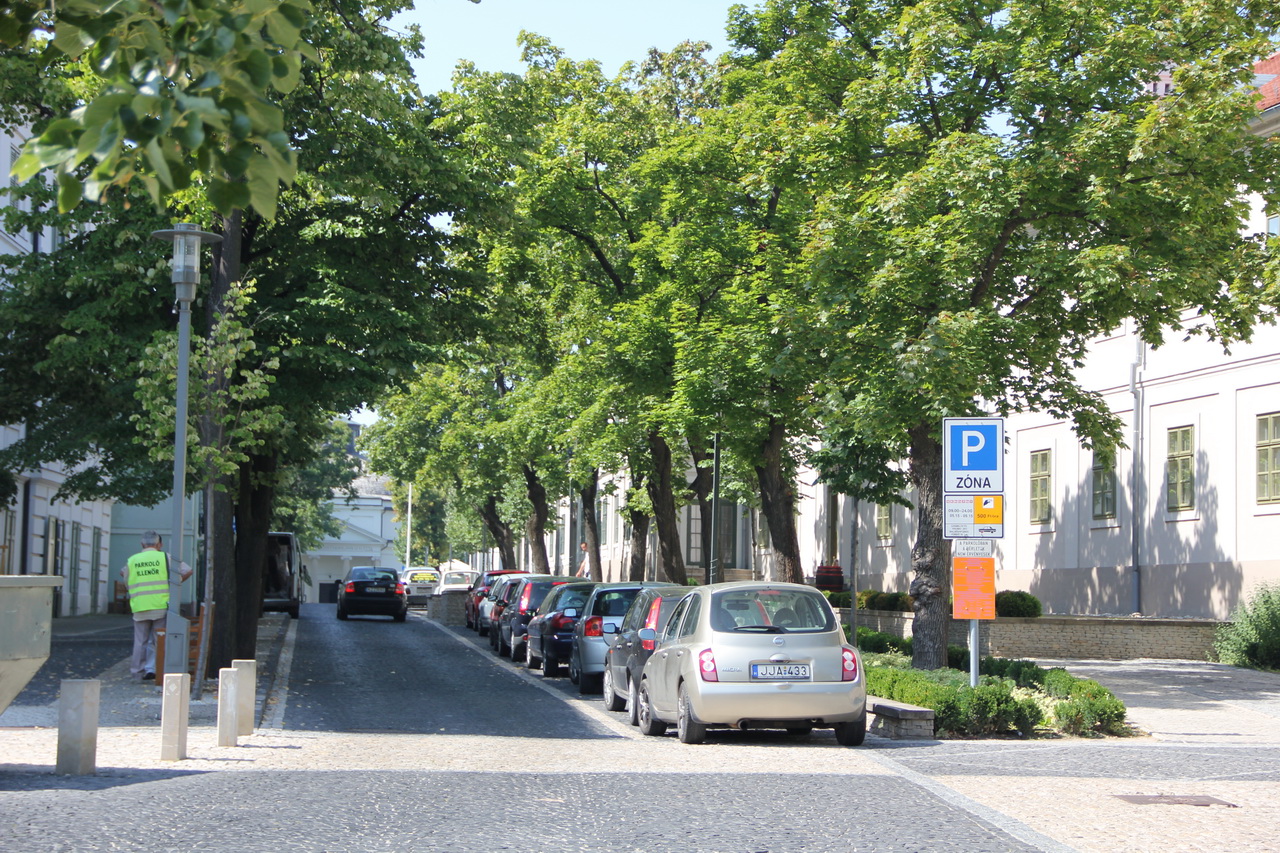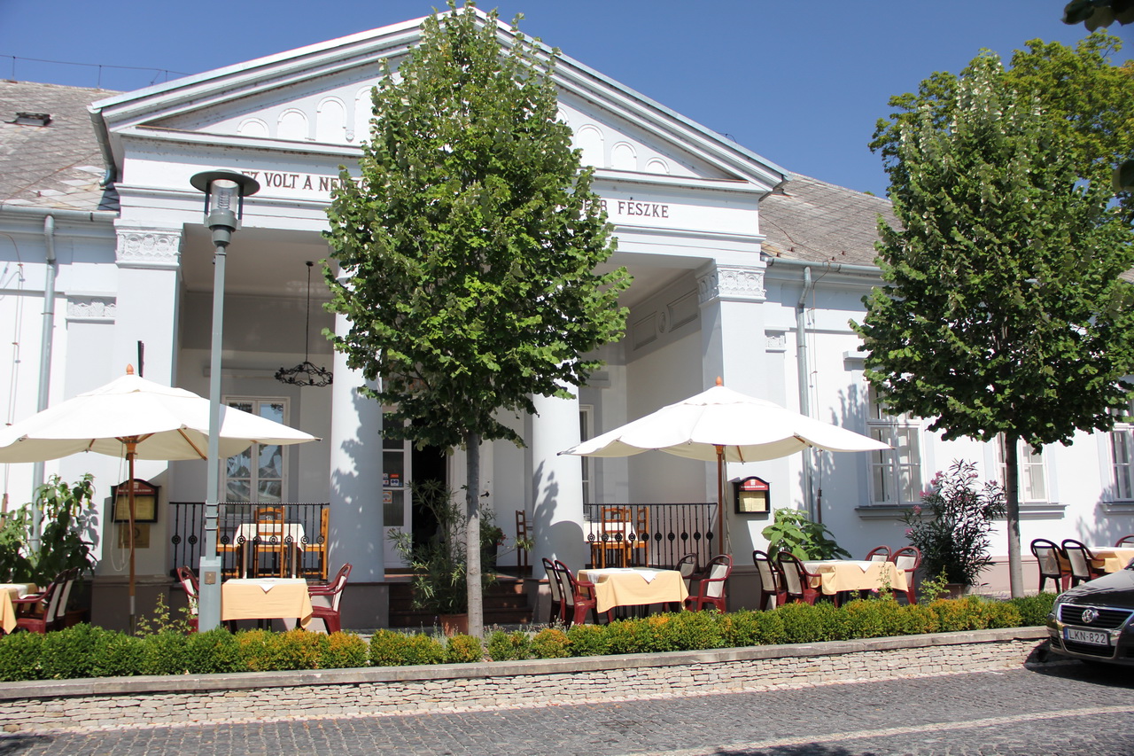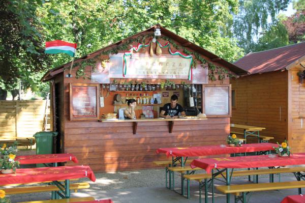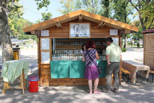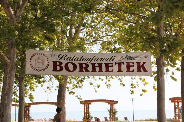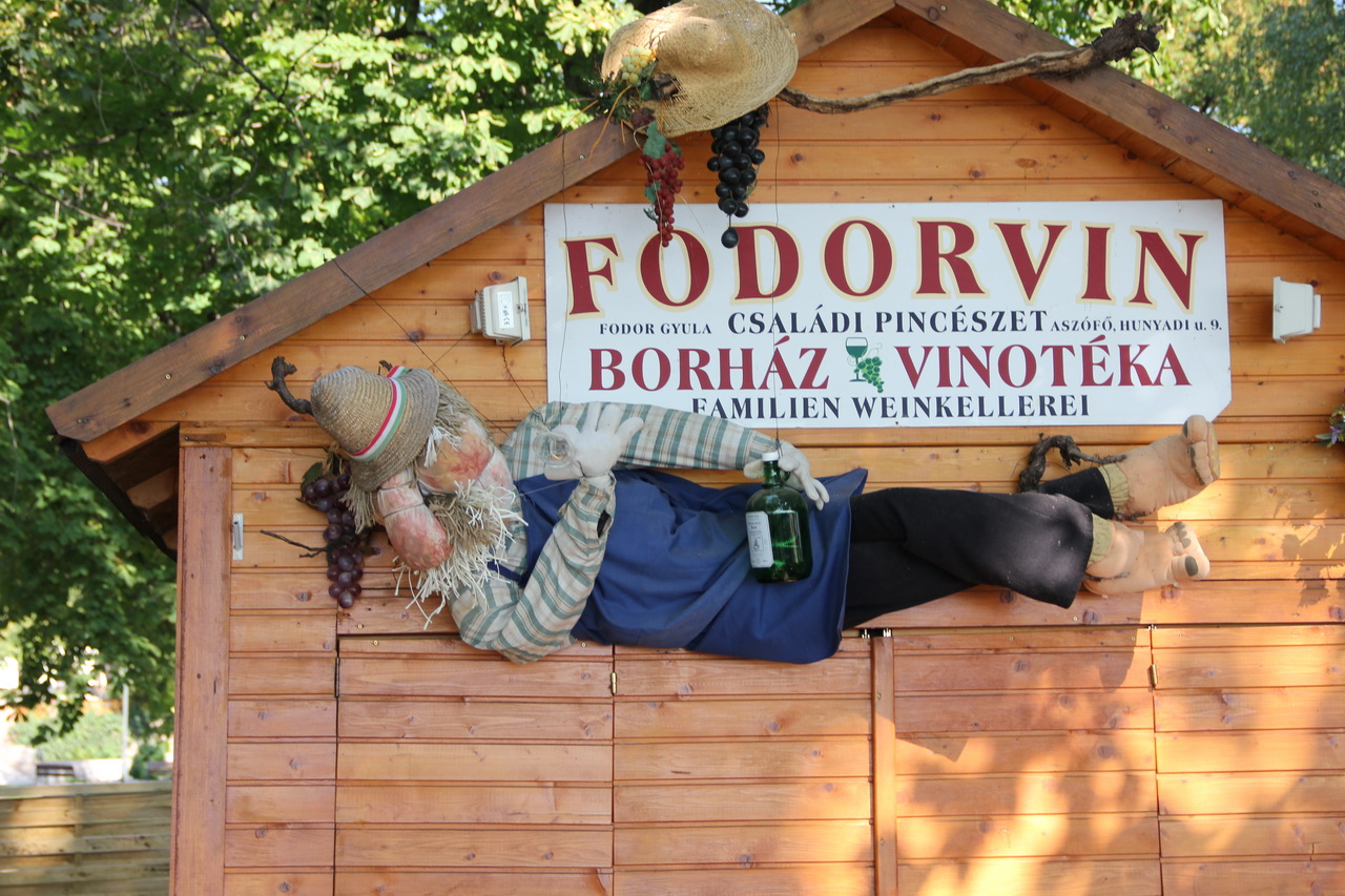 Слева вдоль всей платановой аллеи идут деревянные палаточки, в которых торгуют едой, напитками и сувенирами. В основном, конечно, продают напитки - всевозможные виды вина и палинки. Потому что там проходит винный фестиваль - вот его вывеска. На вопрос, с какого по какое этот фестиваль проводится, местные ответили, что он проводится весь туристический сезон.