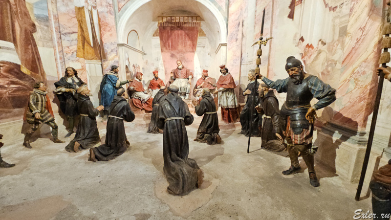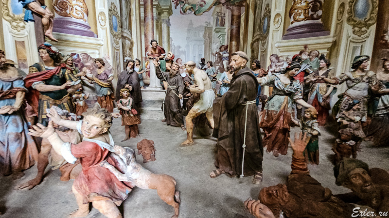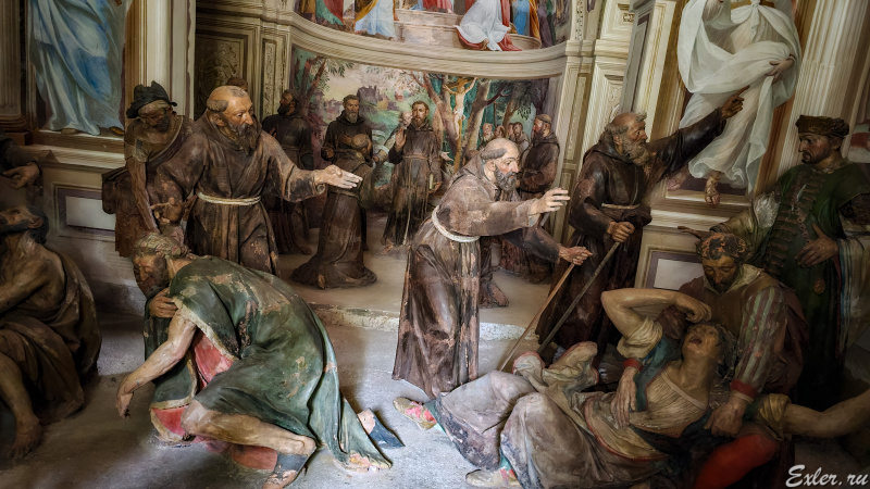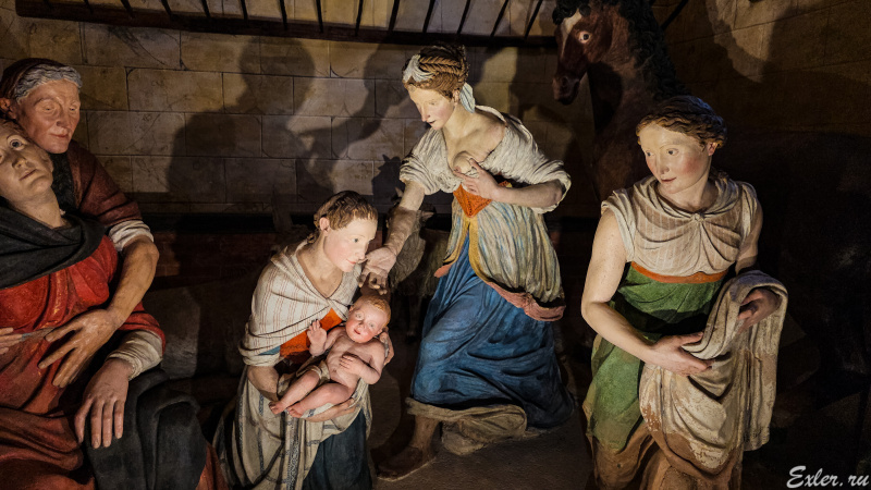 Вот очень характерная сцена - рождение Франциска. Фигуры выполнены из терракоты (обожженная глина), и посмотрите с каким мастерством выполнены одеяния фигур.