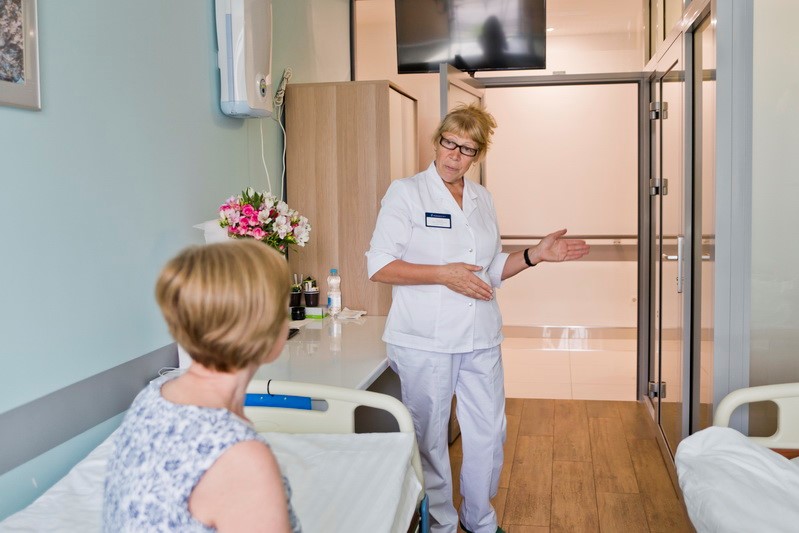 Сестра-хозяйка, Вера Александровна, главная по чистоте и порядку, беседует с пациенткой одной из двухместных палат.