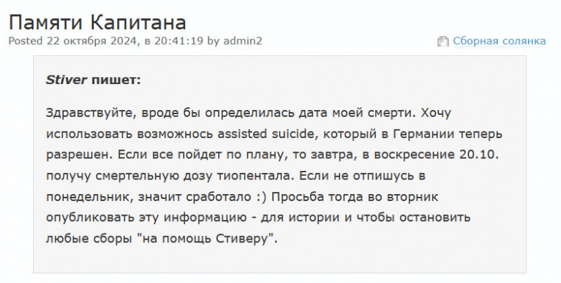 Вчера вечером на Flibusta появилось вот это сообщение, которое означает, что Stiver'а больше нет, он совершил эвтаназию.