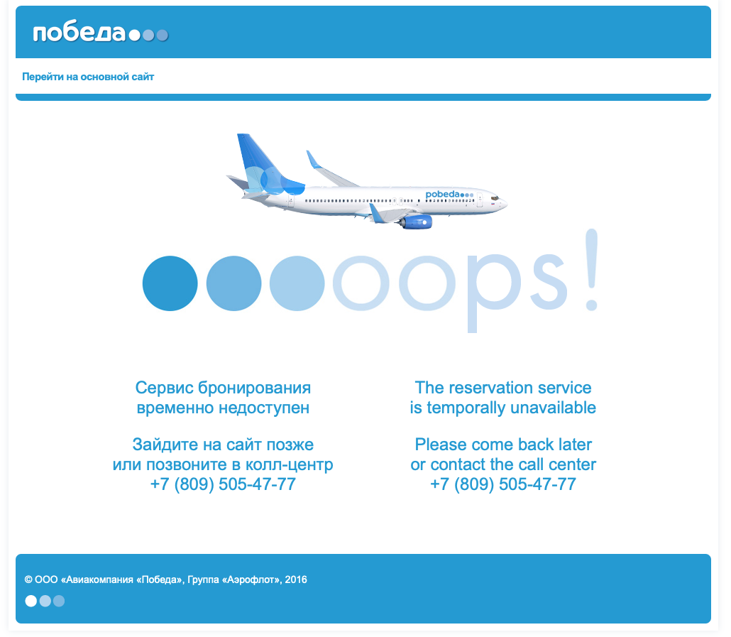 Мои поздравления авиакомпании "Победа". Более угробищного сайта авиакомпании я не встречал никогда в жизни. Я понимаю, что за регистрацию в аэропорту вы берете дополнительные нехилые деньги, поэтому на сайте специально все сделано так, чтобы было невозможно сделать онлайн-регистрацию, но тем не менее хоть какую-то совесть-то надо иметь? В прошлый раз от момента начала регистрации примерно полтора часа было невозможно получить посадочные - все время вылетали какие-то идиотские ошибки.