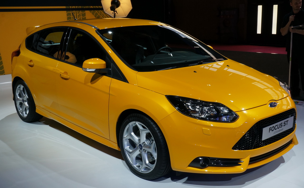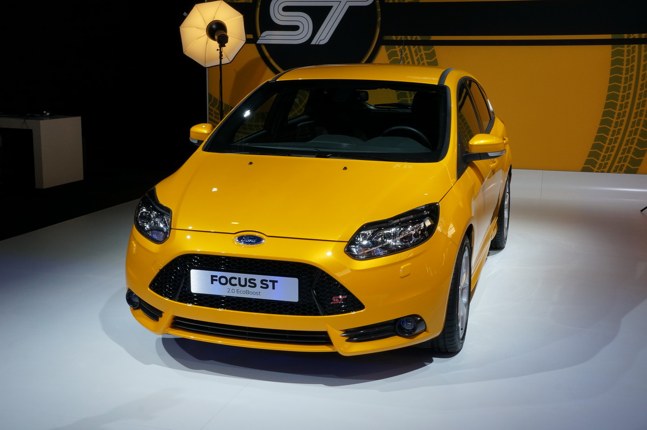 Ну и возвращаемся к автосалону. Последняя модель - пользующийся на выставке повышенным вниманием "заряженный" Ford Focus ST. От обычного "Фокуса" отличается решеткой радиатора как у Fusion и Mondeo, другим обвесом и задним спойлером. Два выхлопных патрубка расположены сзади по центру. В салоне - новые спортивные кресла и карбоновые элементы отделки.