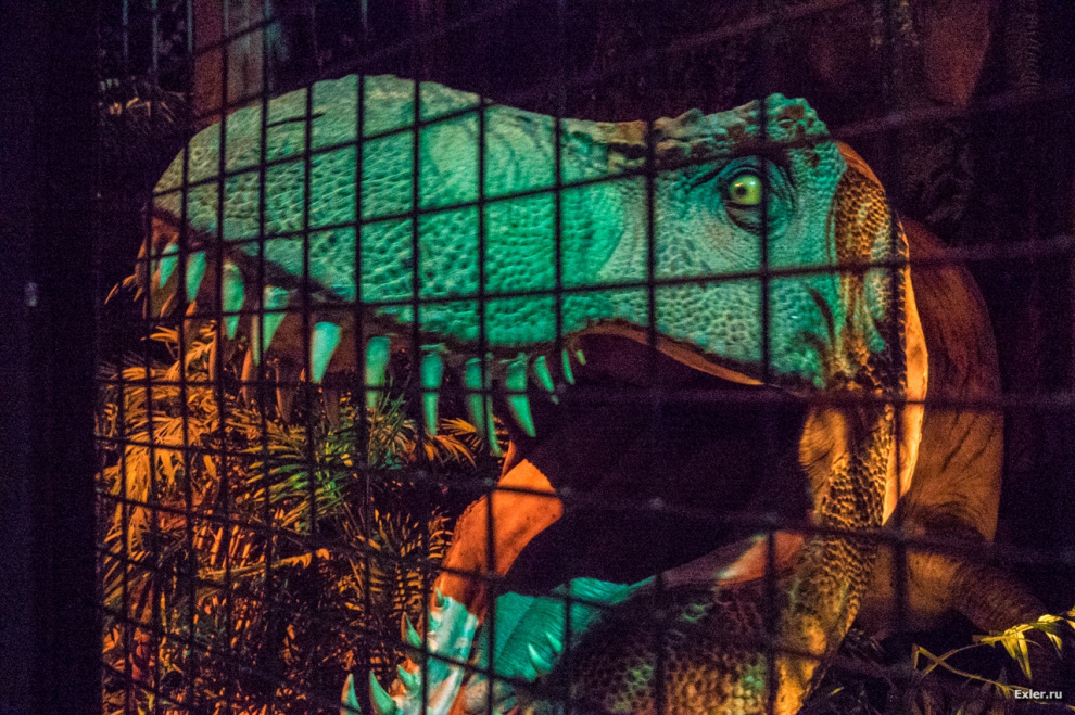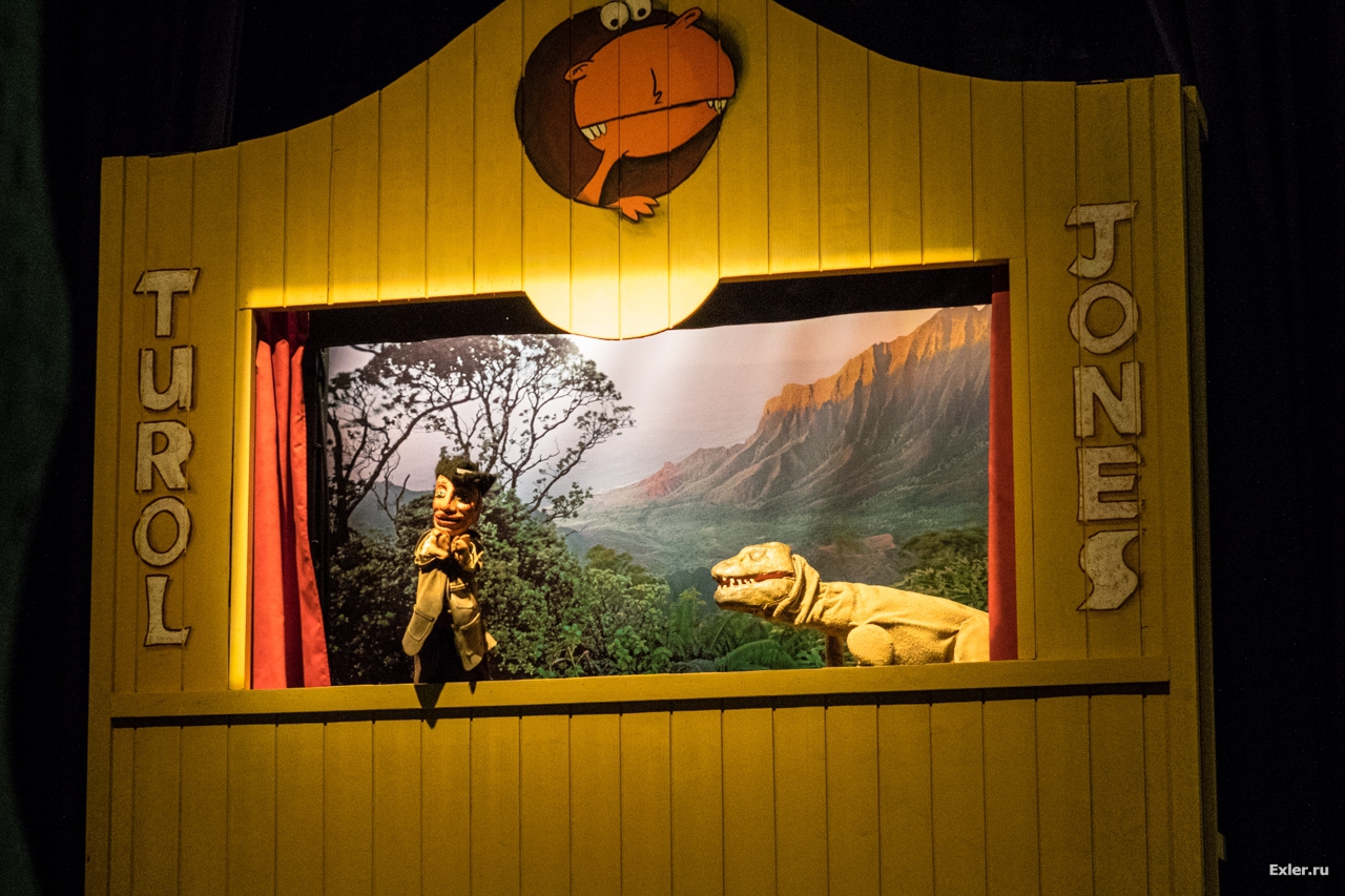 Рядом с детской площадкой - шоу с Ти-Рексом. Проходит каждые полчаса. Сцена изображает жилище Ти-Рекса, ведущая рассказывает о том, как жилось несчастному ящеру в эти суровые времена, ящер выезжает по рельсам из пещеры, качает головой, открывает рот и страшно рычит, а ведущая лазает по скалам и делает вид, что жутко пугается.