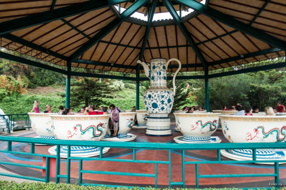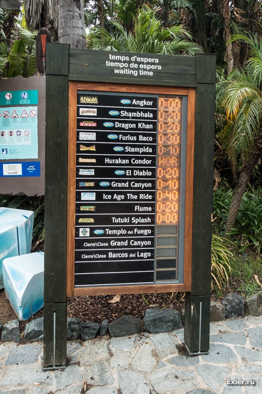 Что удобно - везде расставлены табло, на которых написано, сколько примерно ждать очереди у каждого из крупных аттракционов. На "бочки" надо было стоять 40 минут. (Я где-то видел фото этого табло - там на один из аттракционов надо было стоять 3 часа 20 минут.)