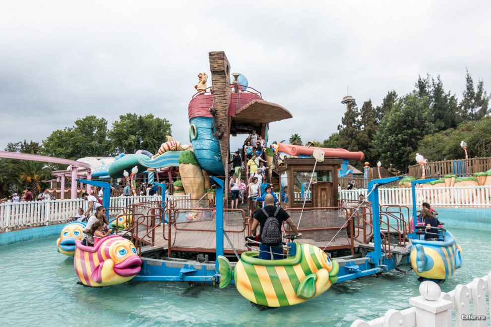 Карусель, где во время вращения можно управлять рулем, который одновременно разбрызгивает воду вокруг на счастливых родителей и на мой фотоаппарат.