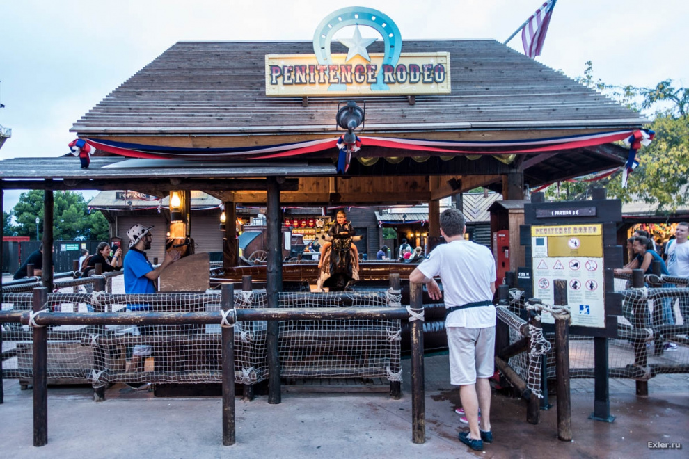 Родео. Специальный сотрудник подбирает режим брыкастости бычка в зависимости от возраста клиента - чтобы дети с него не падали.