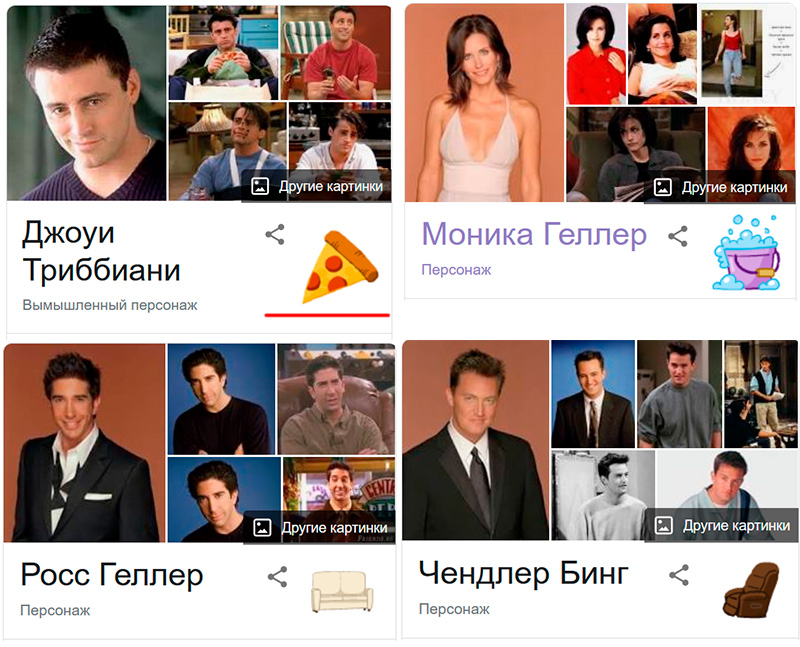 Если вводить в Гугле имена главных персонажей сериала "Друзья" (можно и на русском) - Джоуи Триббиани, Чендлер Бинг, Моника Геллер, Росс Геллер, Фиби Буффе, Рэйчел Грин, - то при выводе информации под фото появится некая картинка, которую можно нажать - будет весело. (Впрочем, для Рэйчел Грин картинка просто выводит разные фото Дженнифер Энистон, но у всех остальных персонажей картинки срабатывают как надо.)