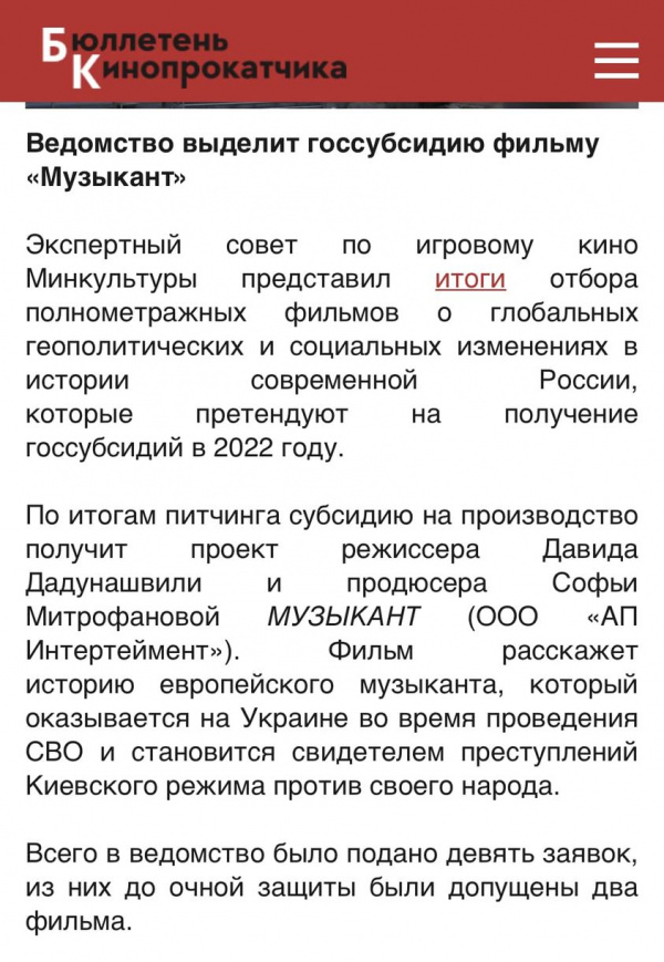Даже во время войны нужно не забывать вваливать огромное бабло в создание эпичных полотен о героизме русских воинах-победителях и о преступлениях нацистов-бондеровцев в Украине. А как без этого? Без этого никуда. И вот кандидатура найдена! Рабочее название фильма "Повесил свою сюртук на крышку гроба музыкант". История простого европейского музыканта, который взял гитару, поехал в Киев и увидел, как украинские нацисты обстреливают собственные электростанции, а русские воины-богатыри своими могучими грудями эти электростанции закрывают.