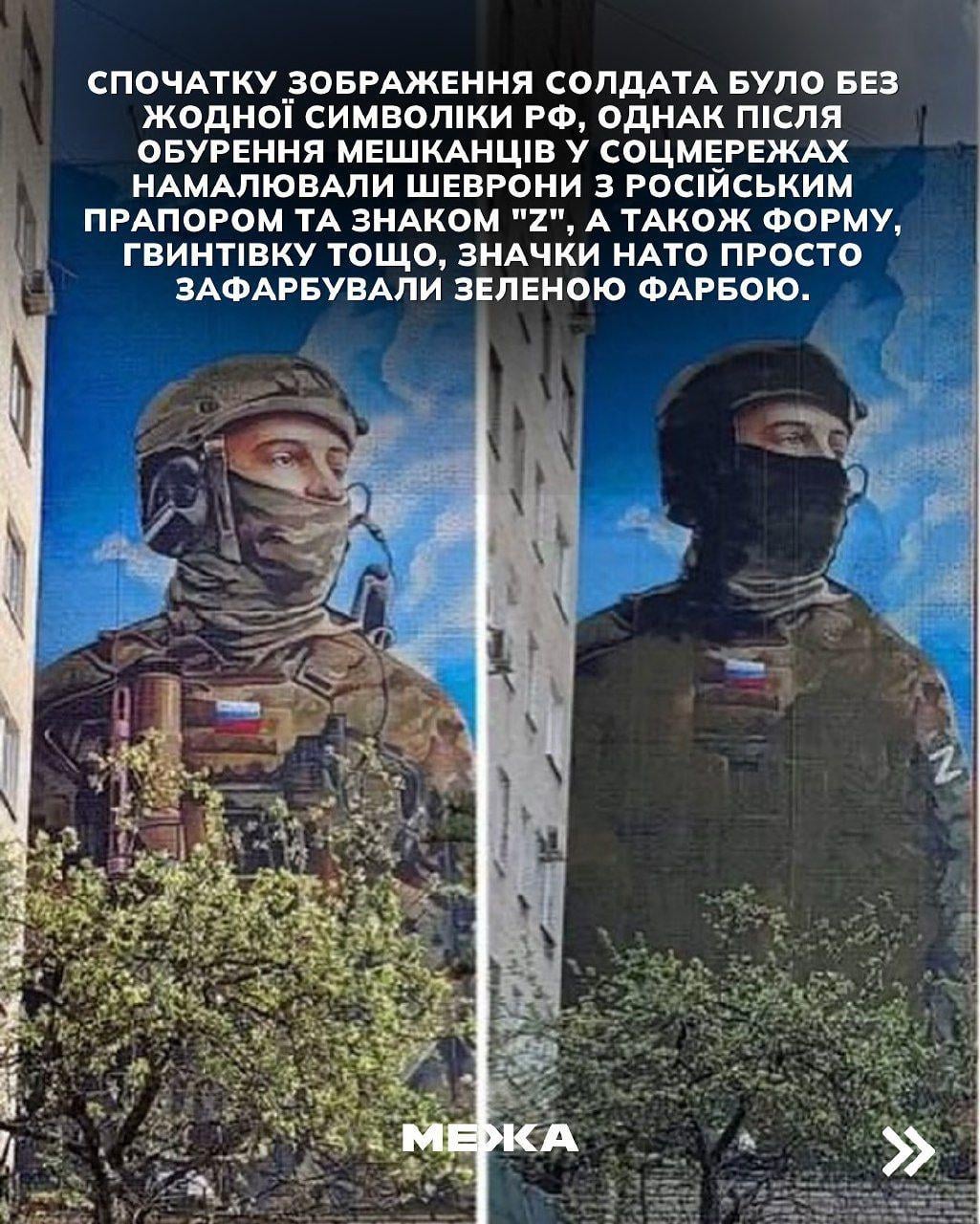Не успели жители города насладиться произведением, как дотошные пользователи Сети выяснили, что на нем изображен солдат 6-го батальона бригады АЗОВ - его снимок циркулирует в соцсетях чуть ли не с начала войны.
