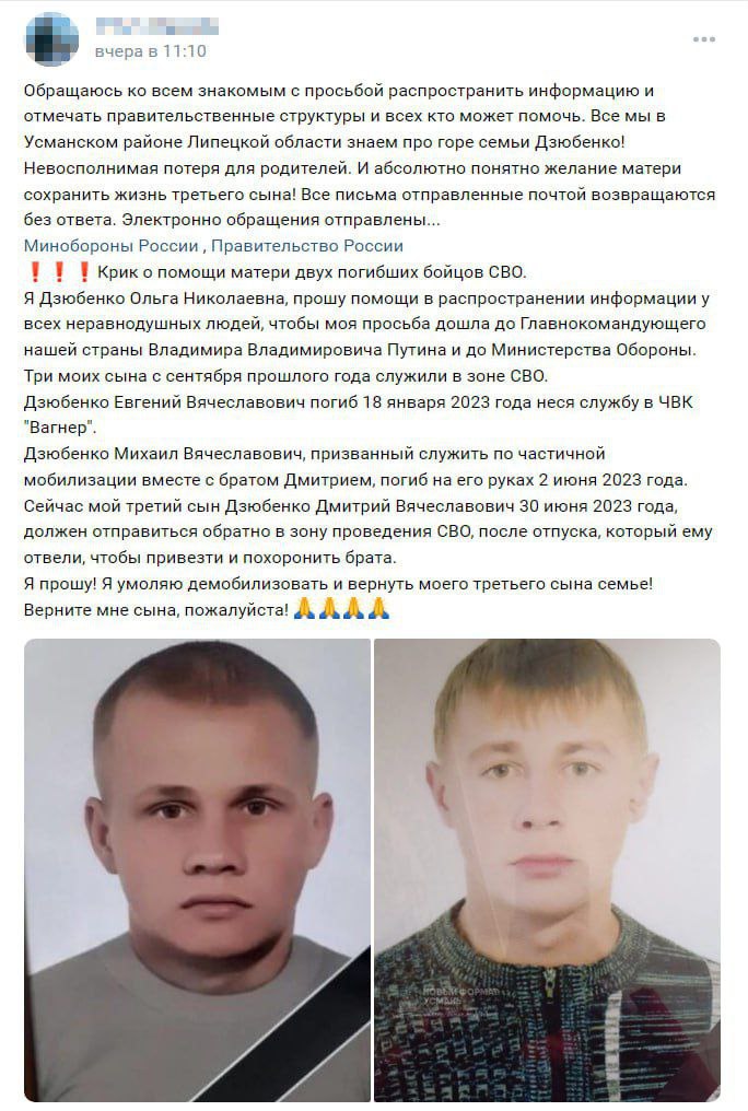 В Липетской области живет 63 летняя Ольга Дзюбенко у которой было 5 сыновей. Из 5 сыновей 3 учавствовали в войне в Украине. Из этих троих живым остался только один. Сейчас эта женщина просит чтобы третьего сына демобилизовали из армии и он остался живым.