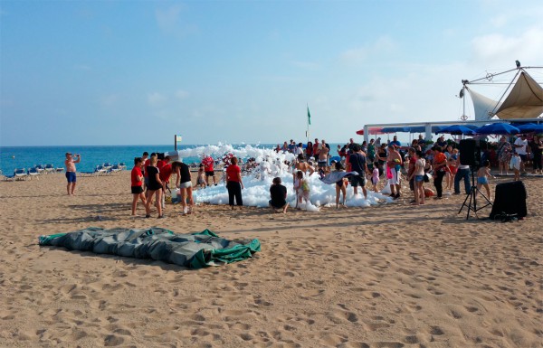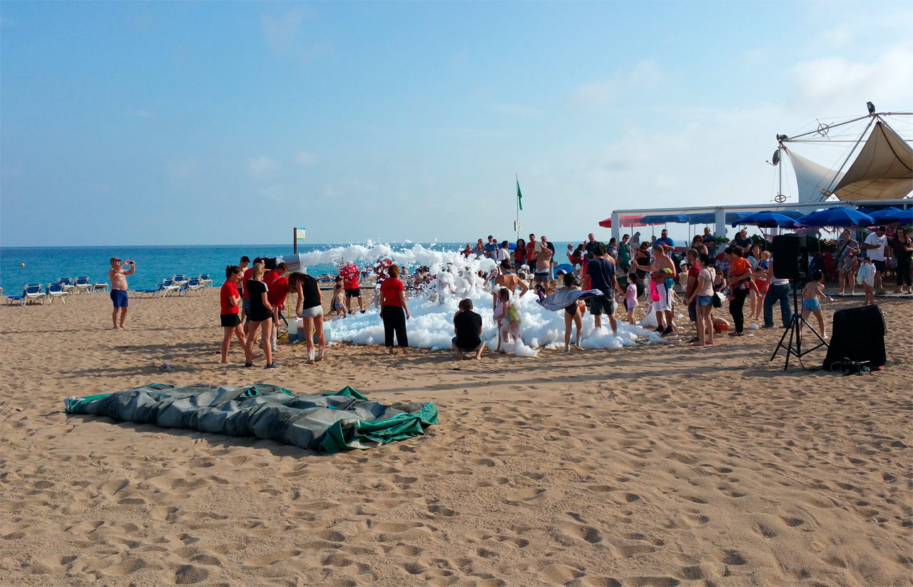 В этом году развлечение для детей устроили просто на пляже, безо всяких загородочек. Просто пенная пушка, которая делает пену различных цветов (у них там стояло штук пять пластиковых контейнеров с разноцветной пеной ) - прямо на песке. Детишки были в восторге.
