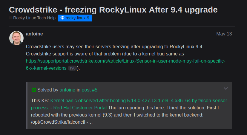 Ага, ага, ЩАС! Как выяснилось, CrowdStrike прекрасно себе поломал Debian и Rocky Linux еще в апреле и мае этого года, просто это никто не заметил из-за ничтожного количества серверных сборок Debian и Rocky Linux в корпоративных применениях.