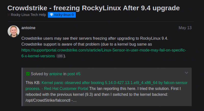 В мае пользователи CrowdStrike также сообщали о подобных проблемах после обновления до RockyLinux 9.4, когда их серверы зависали из-за ошибки ядра. Служба поддержки Crowdstrike признала наличие проблемы, подчеркнув неадекватное тестирование и недостаточное внимание к проблемам совместимости в различных операционных системах.