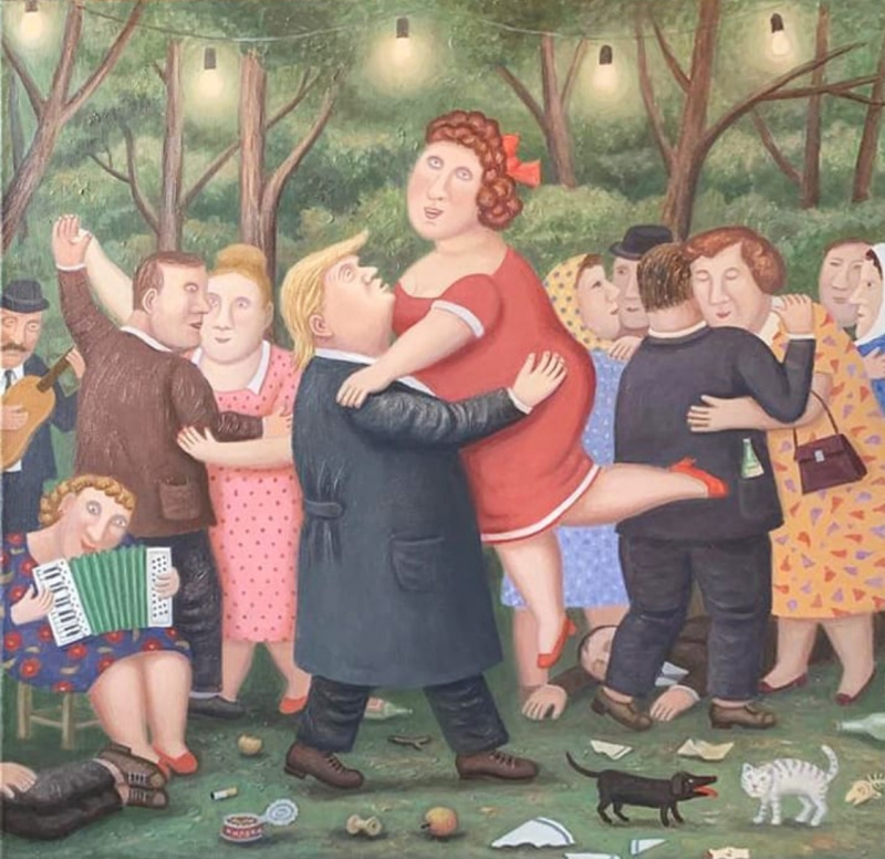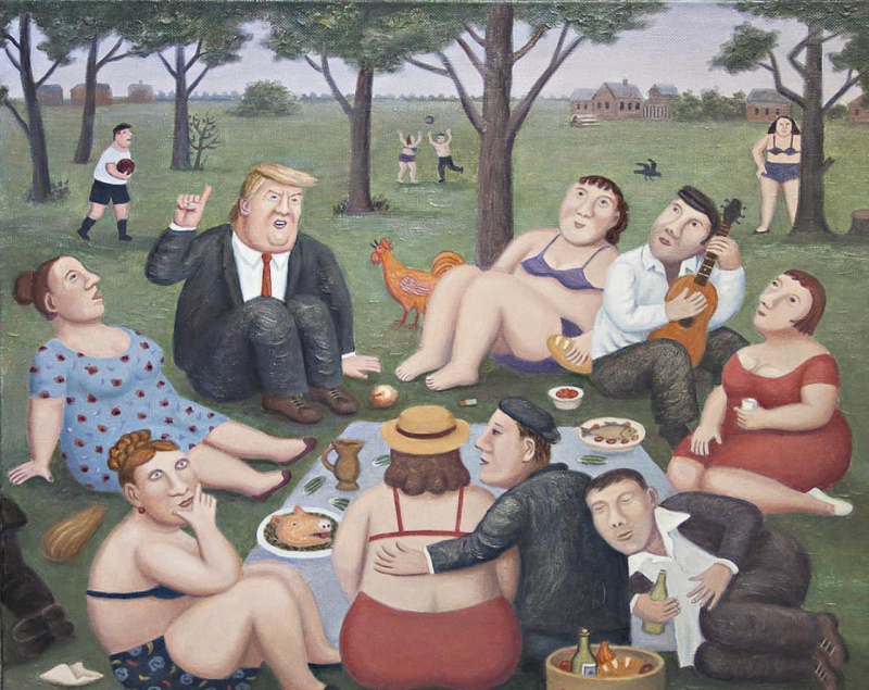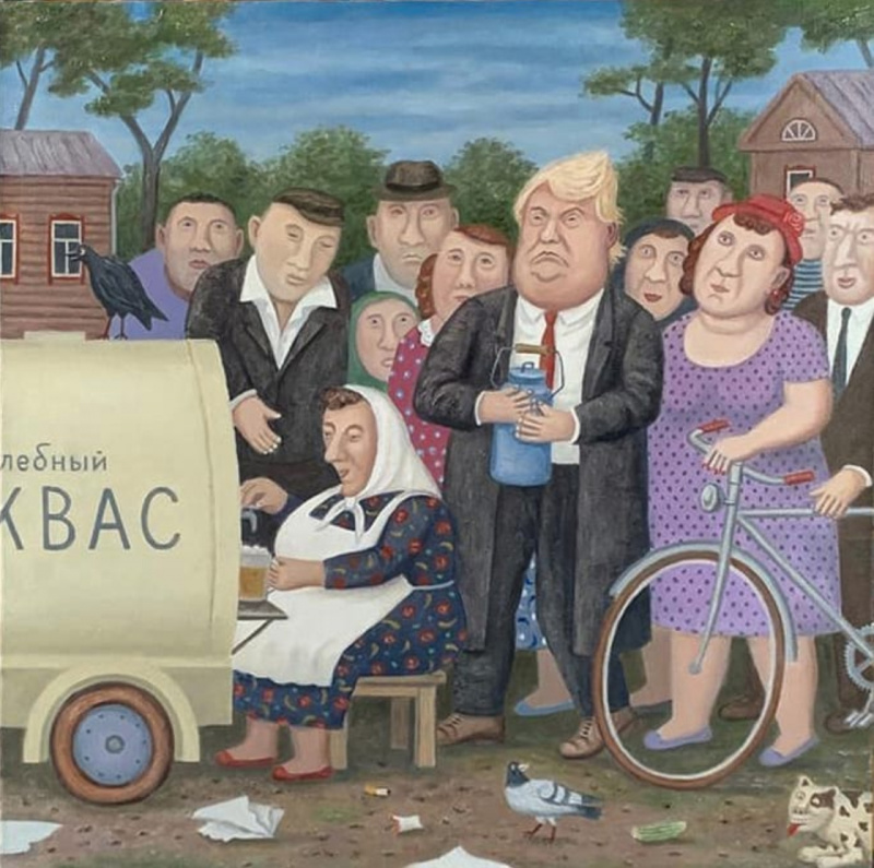 Мне у него больше всего понравилась картина "Неформальная встреча Дональда Трампа с жителями деревни Перемилово".