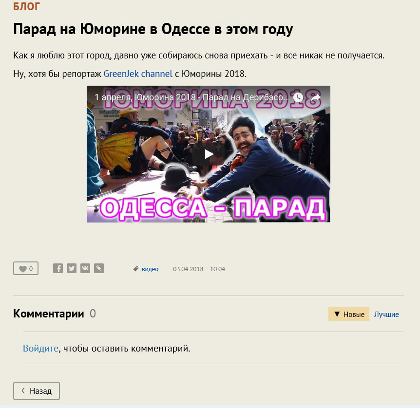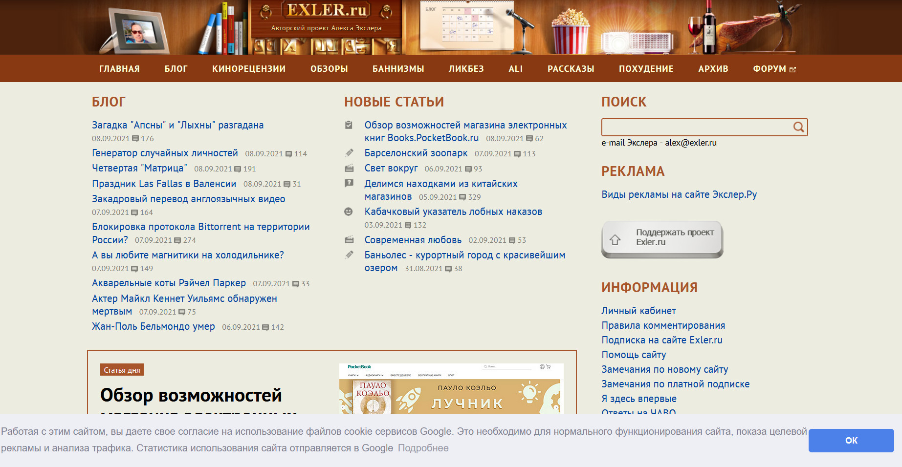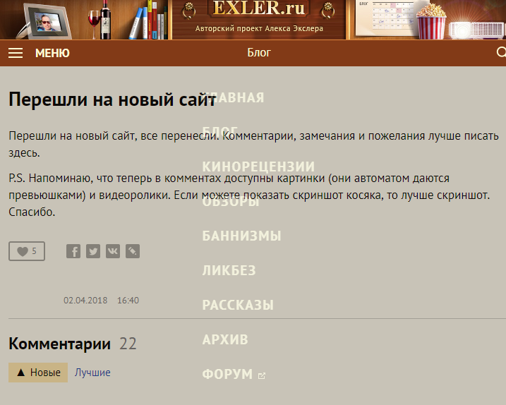 Кнопка "Войти" только под статьей (нет в шапке), надо открывать любую статью пролистать до конца текста, нажать "Войти чтобы добавить комментарий", после входа - меня вынесло обратно на "Блог". Если об этом писали ранее, то извините. Хотела еще добавить - в кинорецензиях наверху "рейтинг Экслера 0,0", хотя внизу оценка проставлена, например вот www.exler.ru