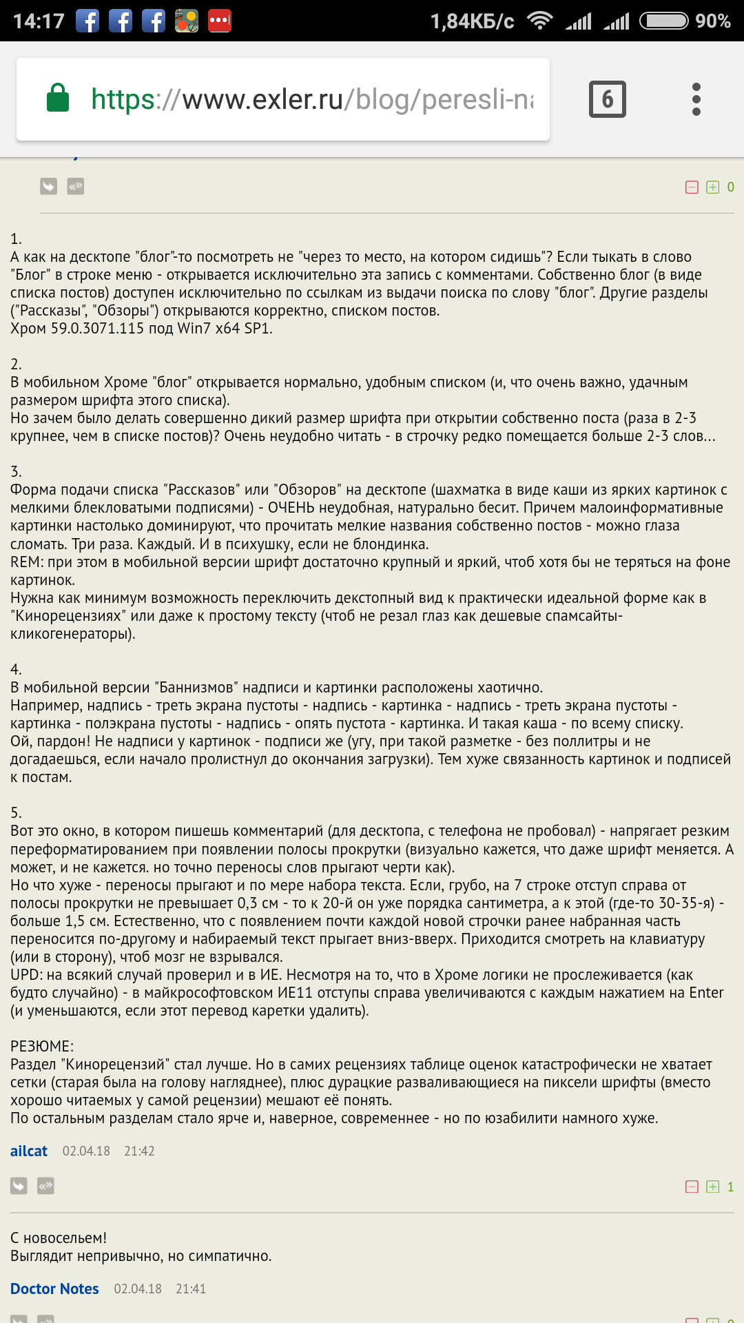 Exler.ru один из немногих сайтов, текст которого не масштабируется пальцами в браузере Google Chrome под iOs на iPad 2 air. Не удобно.