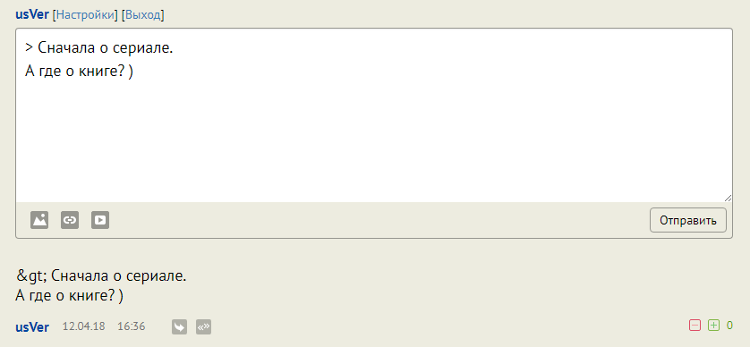 "Отправить", т.е. Ну и редактирование комментариев ожидаем. Кстати, смайлы прикручивать планируете или нет? Хоть минимальный набор из 😄, 😉, 😒, 😄.