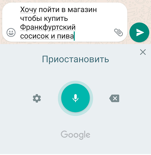 Далее просто диктуете фразу, Google ее распознает и выводит в виде текста. Текст отправляете. Всё.