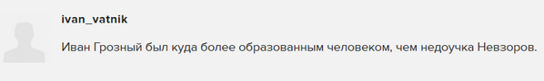P.S. В комментах там, как обычно, прелестный паноптикум. Невзоров также радовалась зверскому убийству Каддафи Клинтон, а Иван Грозный был более лучше образован, чем Невзоров. Чувачки зажигают.