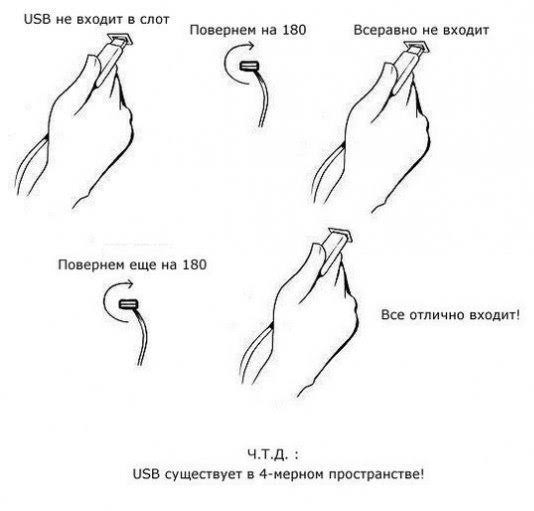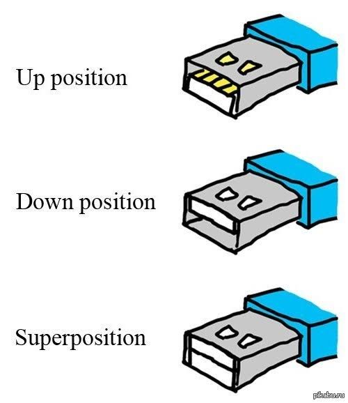 Вне зависимости от того, какой стороной вначале вставлять флешку, она войдёт только на третий раз. Шрёдингер объяснит.