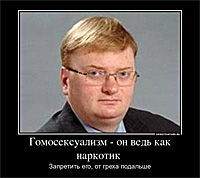 Кстати, тусовочка "содомитов" получилась солидная. На "Демократор.ру" под этим письмом пока подписались 5700 человек. Но просто слишком мало народу об этом знает. Если поднажать, тогда мы тысяч сто соберем запросто. Оно, конечно, понятно, что больные на всю голову уродцы считают "содомитами" всех, кто их в свою очередь считает больными уродцами - это нормально. Так что будем голосовать. (Кнопка "Поддержать проблему", чтобы зарегистрироваться и проголосовать.) Может, поможет. Этих несчастных долбанатов надо изолировать от общества, а не в депутаты сажать. Тем более что он там такой далеко не один.